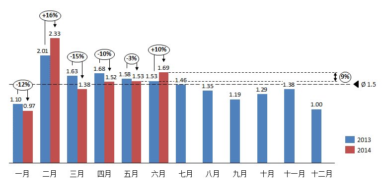 2014年6月份库存系数攀升至1.69
