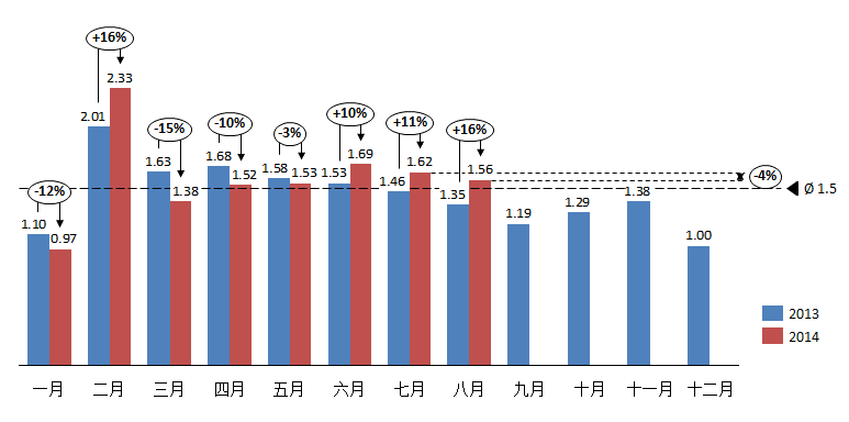 2014年8月份库存系数为1.56