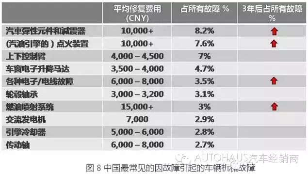海外市场的数据显示,平均每100辆3年车龄的汽车中,有55辆会发生故障, 已使用超过3年的车辆,每3辆中会有1辆出现图7中某一种机械故障!而随着车辆的使用年限增加,各个部件的故障率将不断提升,车辆的维修成本也越高。而对于享受质保服务的车辆,数据显示在质保服务周期内平均每辆车有4-5起赔付案件。
